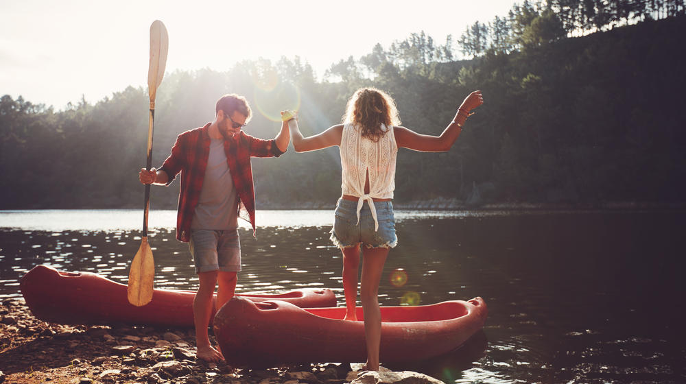 Couple getting into a rowing boat